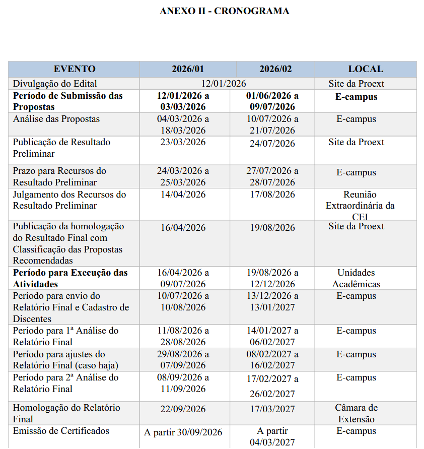 O período de submissão das propostas para ambos os editais já está aberto e segue até o dia 03 de março de 2026, com observação à reabertura do prazo para o Pace, que reabre em 1º de junho e vai até o dia 9 de julho, por meio do e-campus.